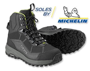 In an industry-first collaborative effort with Michelin®, Orvis introduces the PRO Wading Boot. Built on an outsole compound specifically designed for fly fishing, this revolutionary new sole design is an industry-disrupting advance in wet rubber traction. The Michelin Outdoor Extreme outsole offers 25% better abrasion resistance and a resounding 43% improvement in wet rubber traction over the competition. Using Michelin tire geometry, it offers a wider footprint for stability, a higher ratio of surface contact, and a lug pattern that reduces shock and improves pressure distribution. The two-layer midsole has a co-molded ESS plate that provides improved stud retention and torsional stability. The shock-absorbing Phylon midsole improves “river feel” and compresses less than standard EVA midsoles. Orvis partnered with OrthoLite® to create a 3D molded X25 insole designed for high-impact sports, delivering maximum comfort and arch support. An industry-first cast PU upper eliminates seams while providing a zoned cage for added stability, grip, and extreme abrasion resistance without the added bulk. The boot is higher cut for ankle support and lined with closed-cell foam. Scratch rubber at the toe cap and heel for abrasion resistance, an oversized heel pull for easier on-and-off, and tightly woven laces reduce broken laces. Imported.