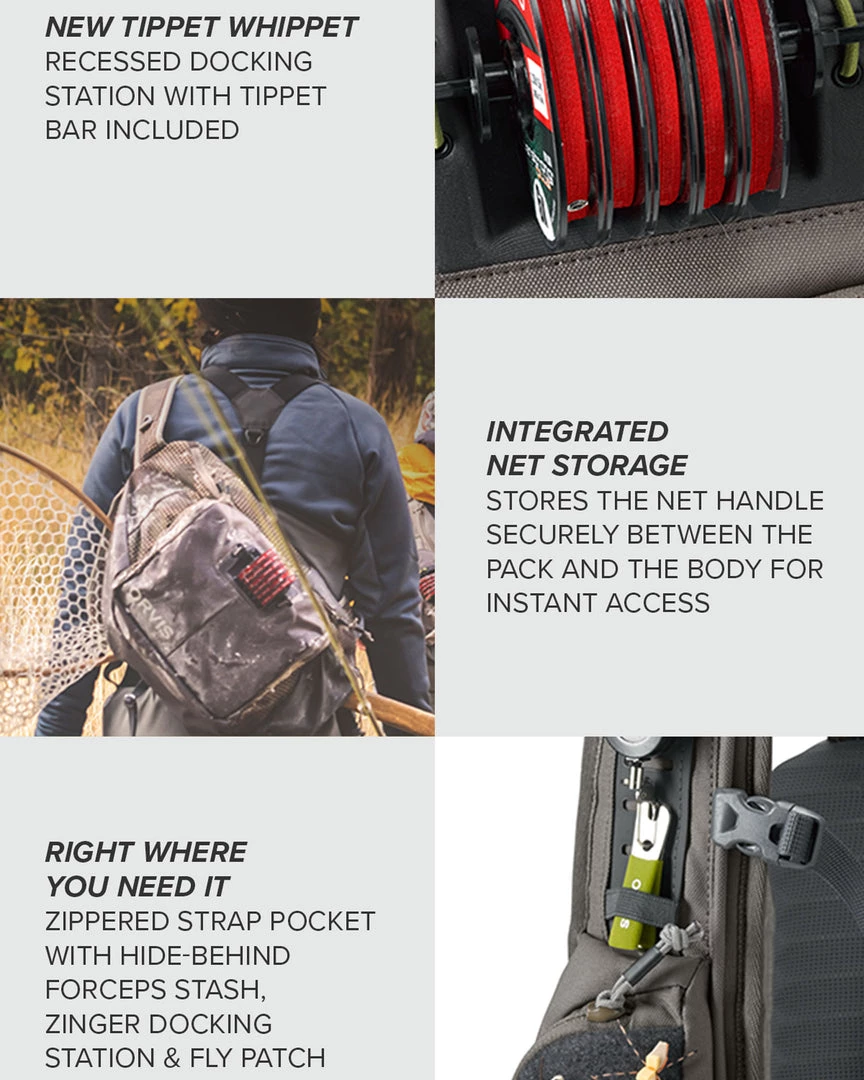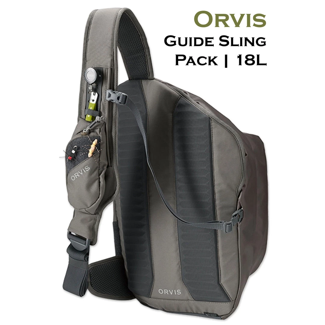 Whether you’re a fly-fishing guide or an angler looking for exceptional capacity, durability, and convenience, the Orvis Guide Sling Pack provides a multifunctional, 100% recycled CORDURA® ECO; platform designed to store and organize, offering easy, intuitive accessibility. With 18 liters of capacity and innovative new features, the Guide Sling can carry multiple large fly boxes, packable rain gear, water, and all the tools and accessories needed for a full day or even days on the water. New features include the Tippet Whippet recessed docking station with tippet bar included for instant, fixed, and fumble-free access for up to six spools. Integrated net storage stores the net handle securely between the pack and the body for instant access. Large main body storage pocket has an internal stretch mesh stash spot and zippered pocket with key fob. Smaller main body zippered pocket with internal zip pocket and organizational drop pockets for smaller items. Front strap zippered pocket with hide-behind forceps stash, zinger docking station, fly patch, and rear D-ring. Other features include an adjustable sternum strap, zinger/nipper pass-through, easy-swing handle, water bottle pocket with elastic retainer, and ridged back panel for increased structural integrity and air flow. Left shoulder design frees up casting arm and shoulder. Weight: 800g/1.76 lbs. Shell: 100% recycled CORDURA® ECO 600 denier polyester with strategic TPU coating. Liner: 100% recycled 200 denier polyester. Spot clean. Imported. Tippet and accessories not included.