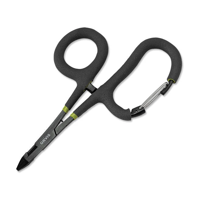 Quickdraw Forceps are the ultimate hemostat, thoughtfully designed for fly fishing from the tips to the jaws to the handle. Powered by Loon Outdoors, the tight angles are engineered to accommodate all fly sizes, allow for easy hook removal, and can crimp even the heaviest of barbs. Oversized thumb and finger holes accommodate large or gloved hands and the compact cutting edge in the jaw easily clips light or heavy leader. Features a carabiner finger loop, flat geometric jaw for easy hook removal/debarbing. Surgical stainless steel with a stealthy matte black rust-resistant finish. Comfy Grip double-dipped handle provides extra tackiness. Eye-clearing needle and locking handles. Imported.