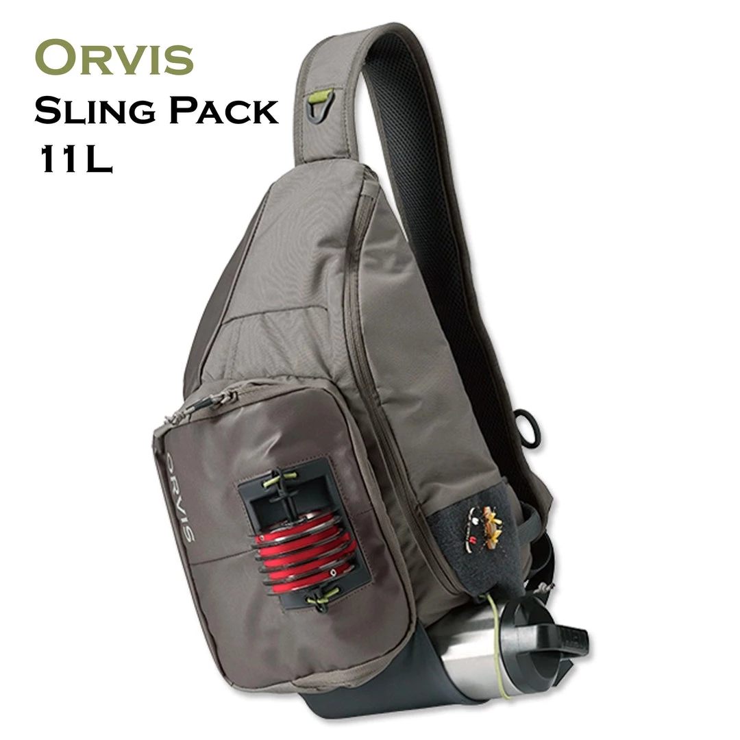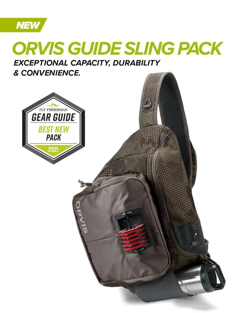 The best-selling Orvis fly-fishing Sling Pack has been updated and improved not only for durability, but with innovative new convenience features as well. The 100% recycled CORDURA® ECO; platform is designed to store, organize, and offer easy, intuitive accessibility while staying completely out of your way when fishing. New features include the Tippet Whippet recessed docking station with tippet bar included for instant, fixed, and fumble-free access for up to six spools. Main compartment has zippered security pocket with key fob and stretch mesh pockets for small sort storage. Front drop-down has zippered pocket with elastic mesh slip pockets. Lo-pro zinger/nipper pass-through, easy swing handle, and water bottle holder with retainer. Front strap “dashboard” offers multiple docking stations for forceps and small tools as well as sliding adjustment for sternum strap. Left shoulder design frees up casting arm and shoulder. Weight: 500g/1.1 lbs. Shell: 100% recycled CORDURA® ECO 600 denier polyester with strategic TPU coating. Liner: 100% recycled 200 denier polyester. Spot clean. Imported. Tippet and accessories not included.
